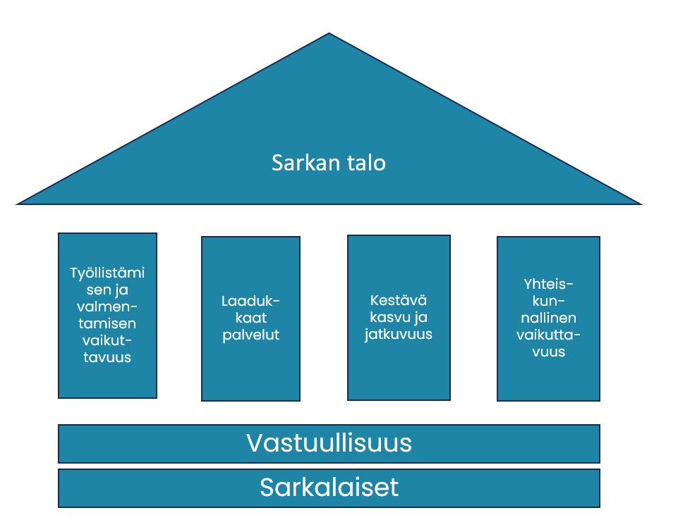 Me Tampereen Sarkassa työstämme strategiaamme liiketoimintamuotoillen yhdessä henkilöstön, hallituksen, asiakkaiden ja sidosryhmiemme kanssa. Olemme kehittäneet sosiaalisten innovaatioiden muotoiluun soveltuvan mallin, joka tuottaa arvoa kaikille osallistujille. Strategisia valintojamme viemme tekemiseksi rullaavan strategian mallilla, jonka teemoja kehitämme OKR-mallilla.